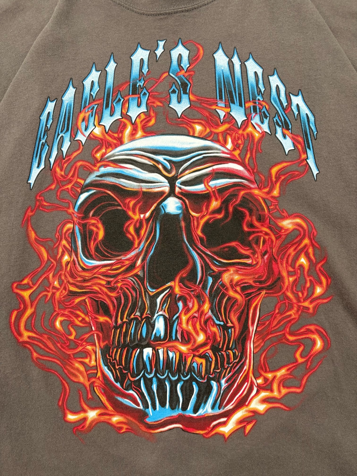 フロントにはフレイムスカル、両袖にも炎と共に流れるようにプリントされたスカルグラフィック。