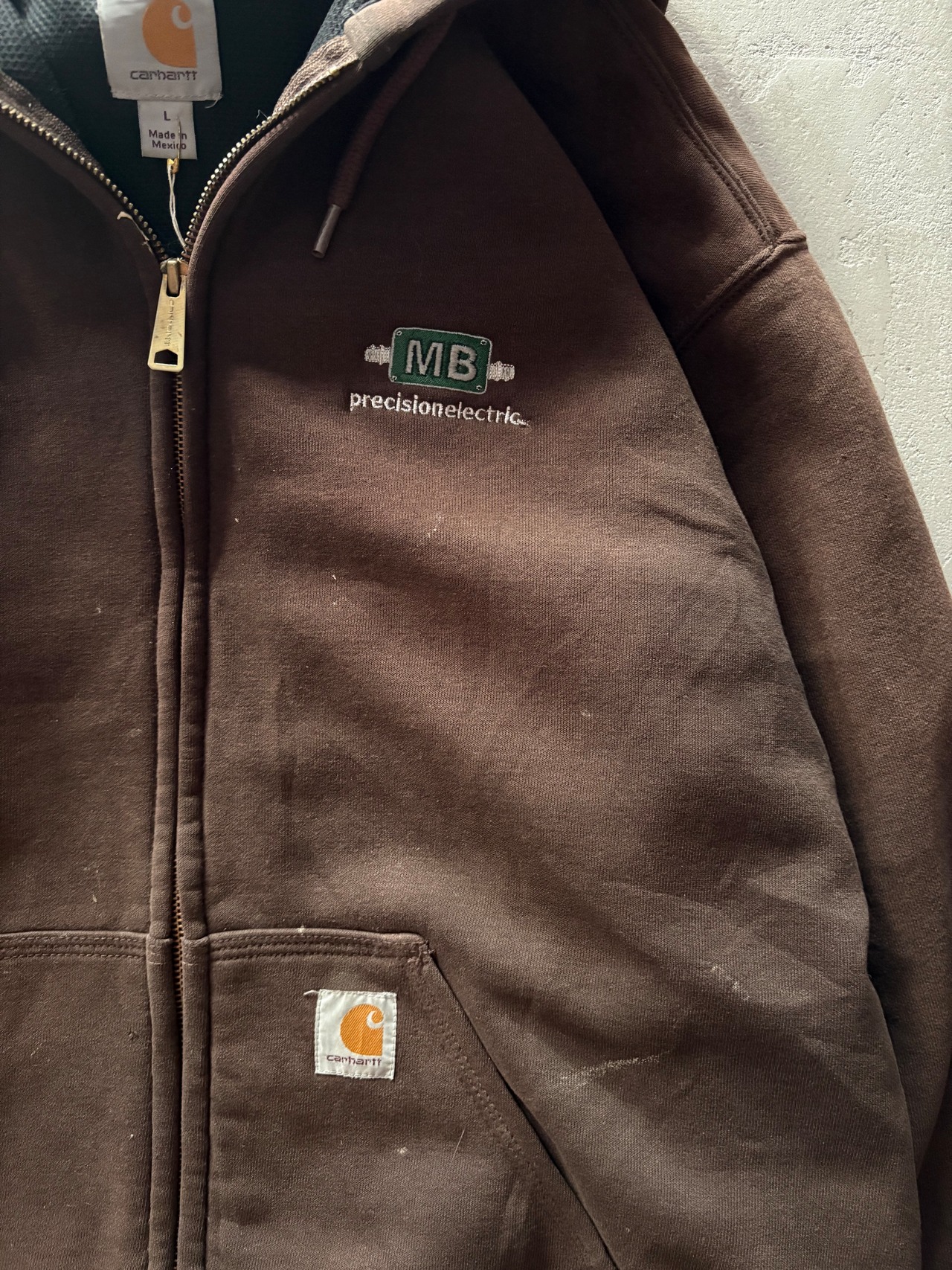 ブラウンボディに“MB precision electric.”の企業刺繍がワンポイントで施された1着。