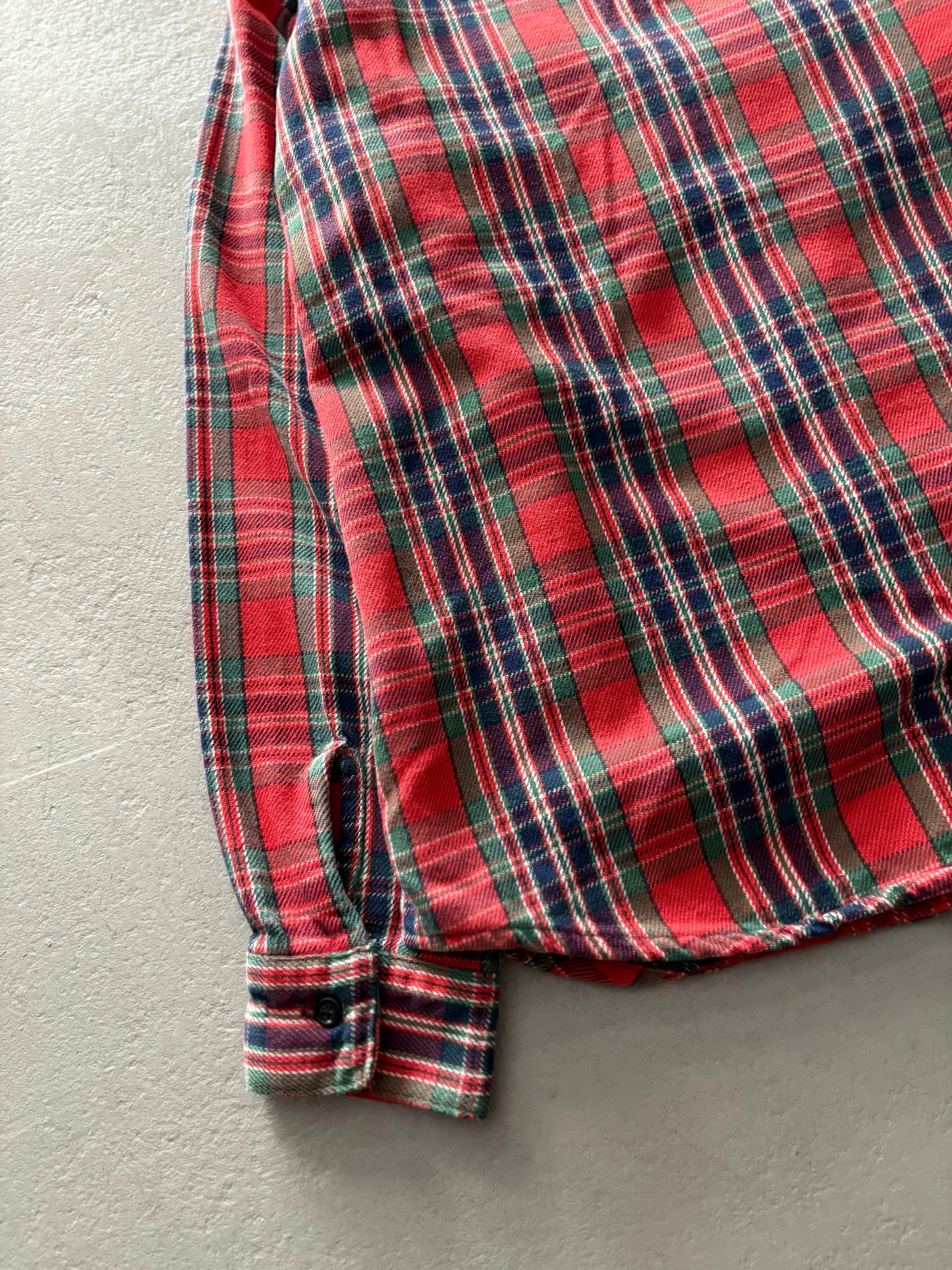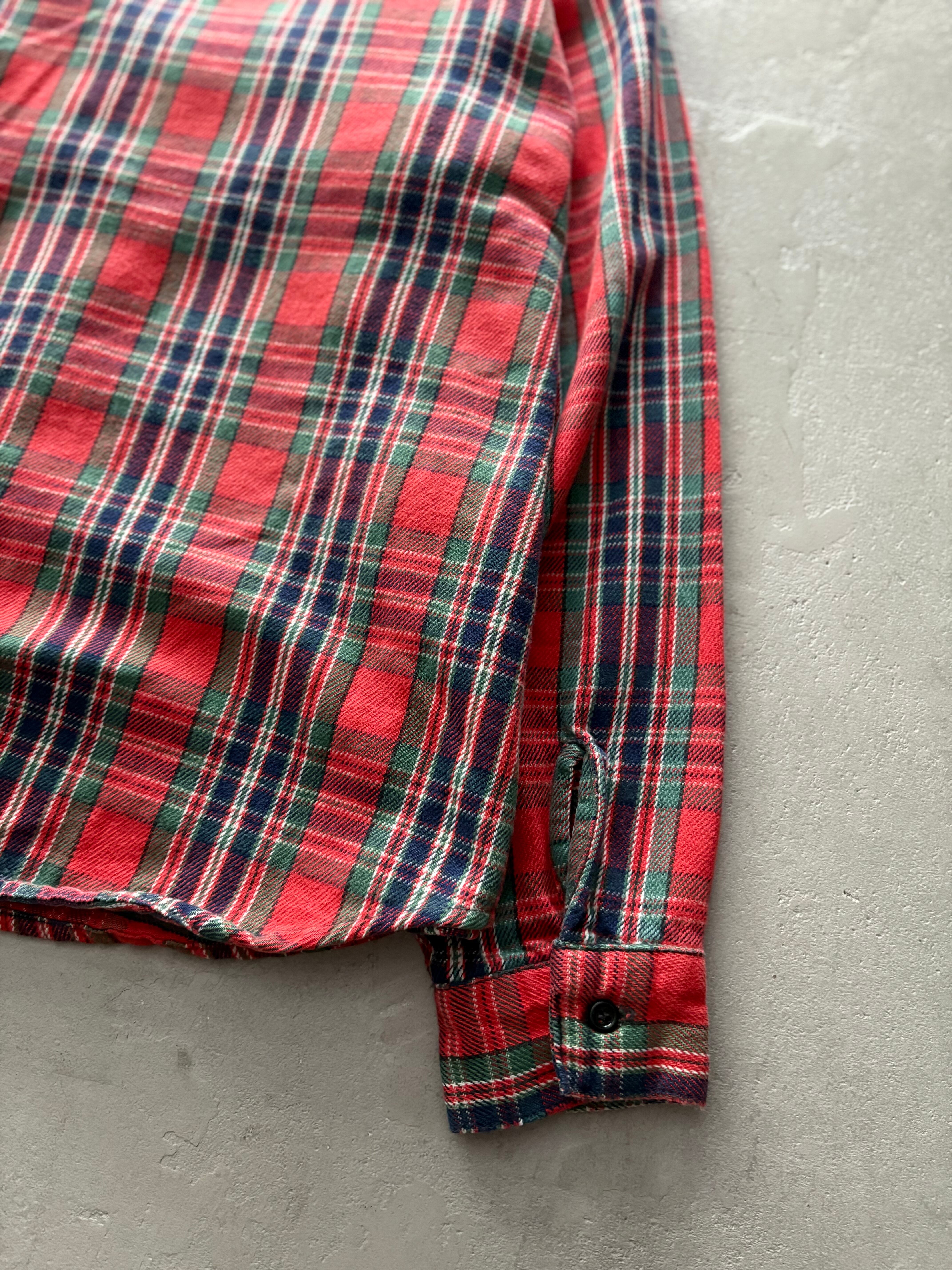 くすんだ赤をベースに、グリーンとネイビーを効かせたクラシックなタータンチェック柄。無骨ながらもどこか懐かしさを感じる色味で、ネル特有の毛羽立ちが秋冬らしい雰囲気◎