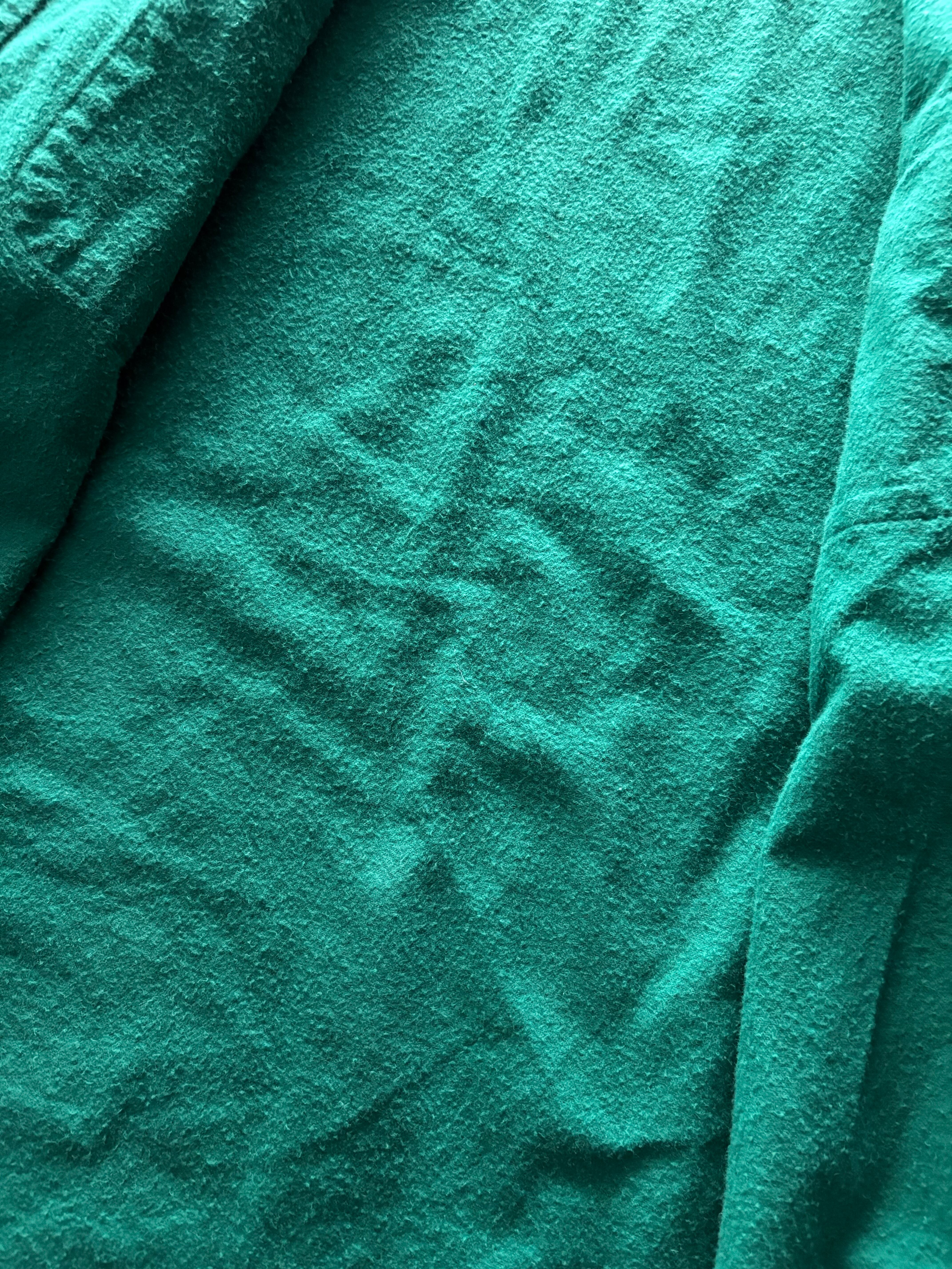 エメラルドグリーンのような独特な発色が印象的で、チェック柄が主流のネルシャツの中では珍しい無地仕様。