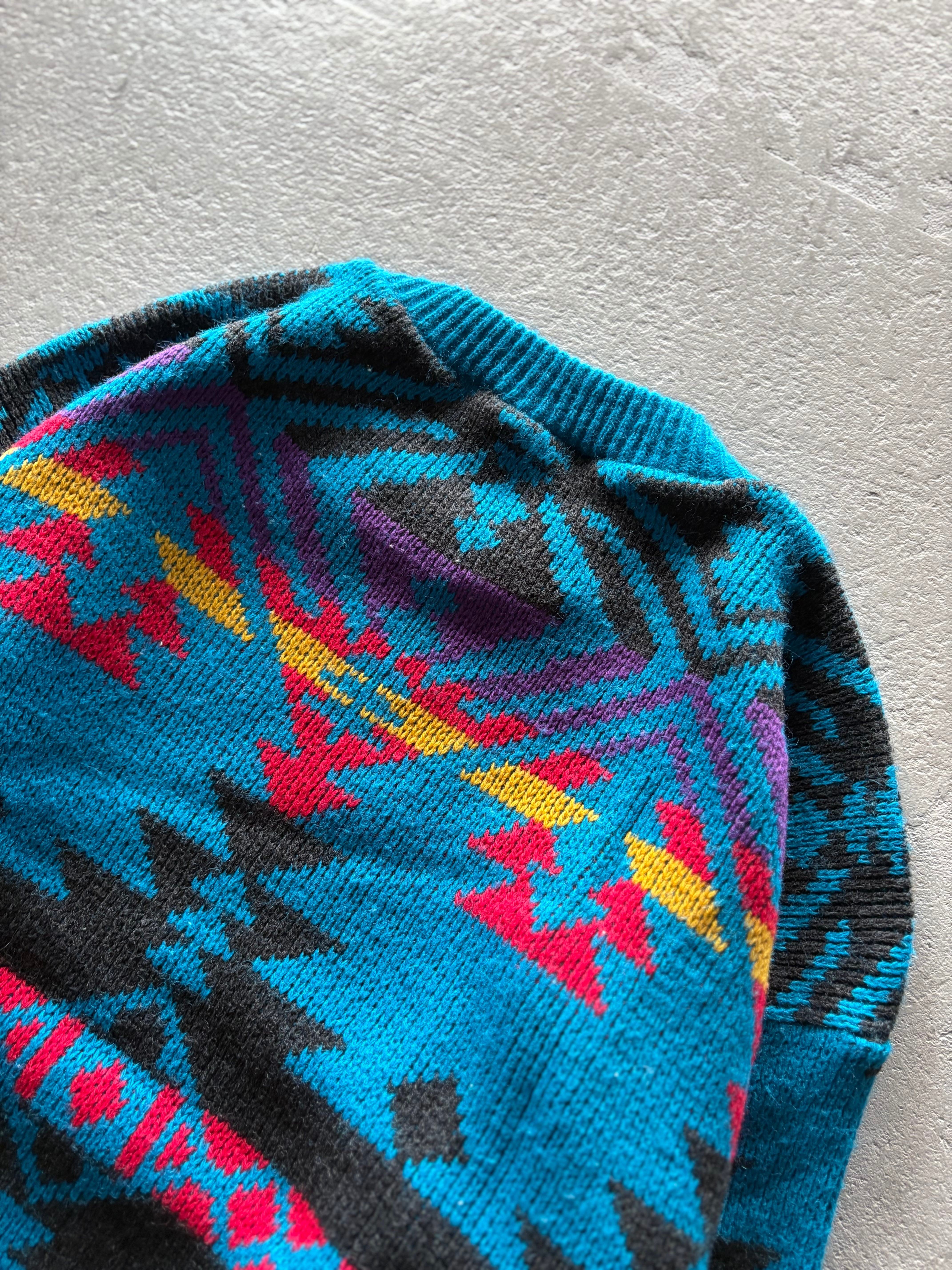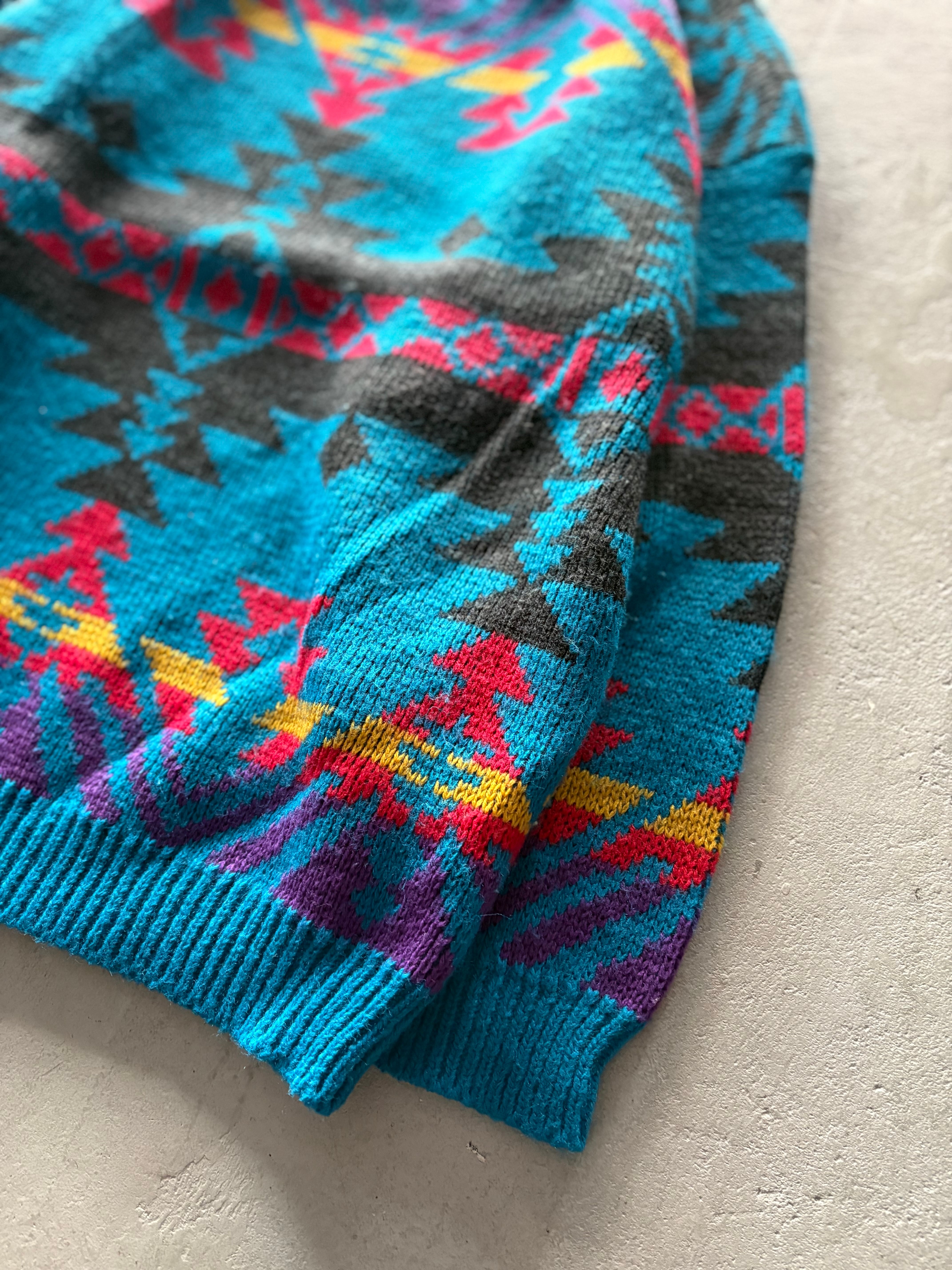 圧倒的な存在感を放つ総柄ネイティブパターンと、鮮やかなカラーが特徴的なニット。