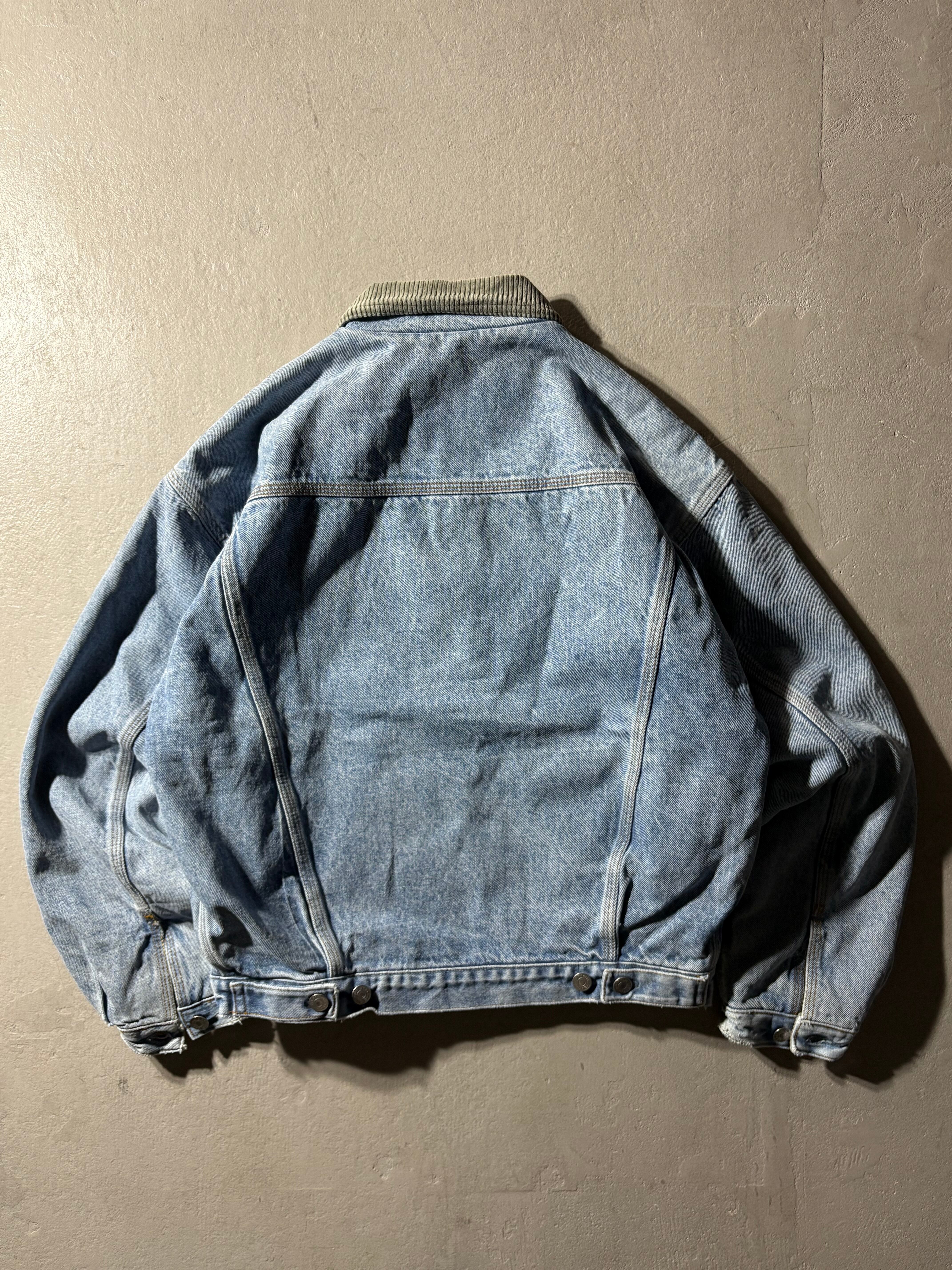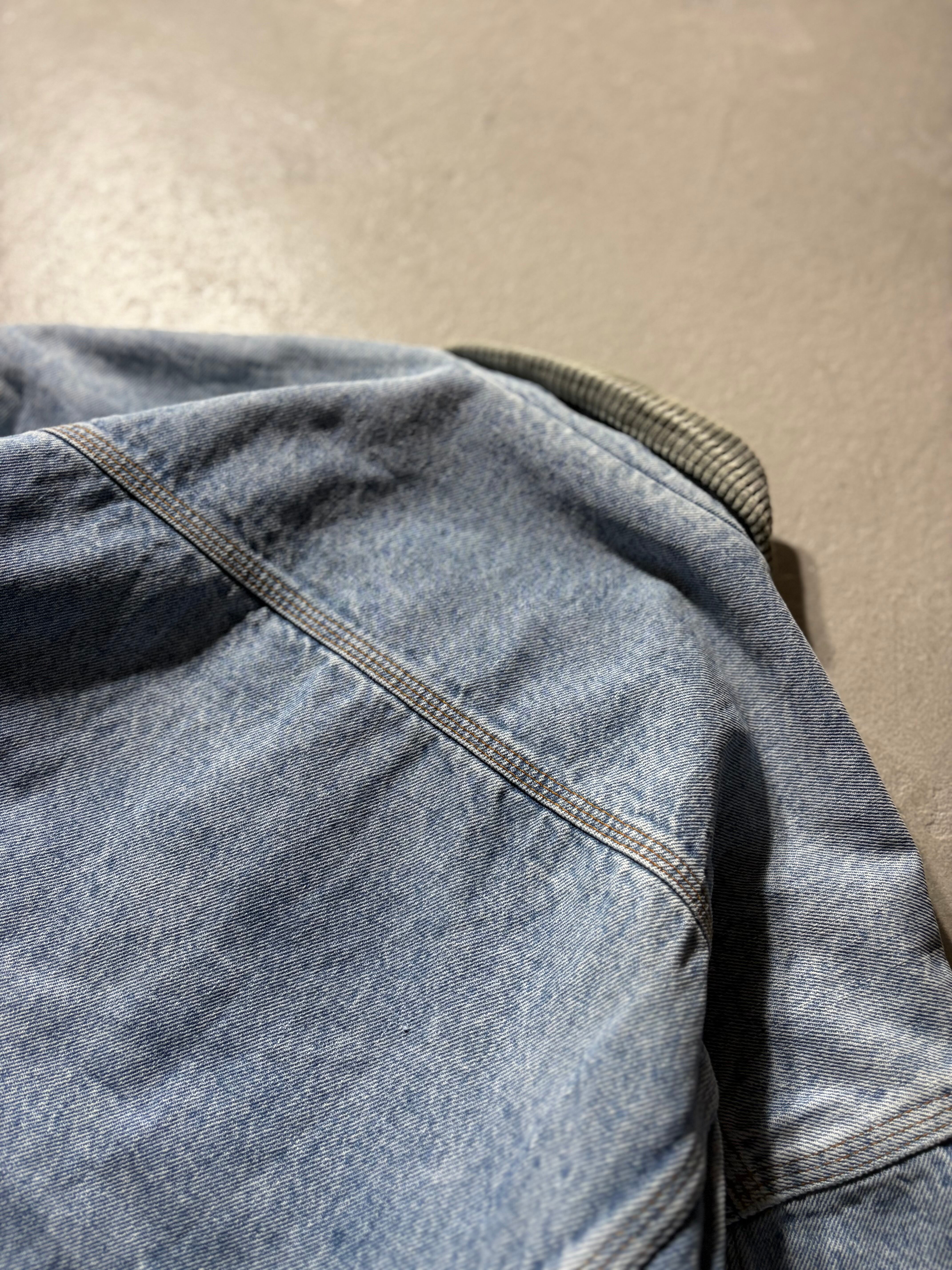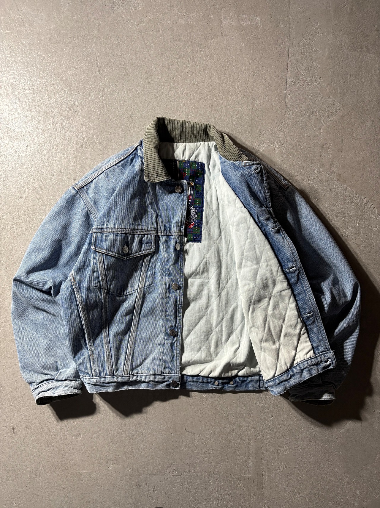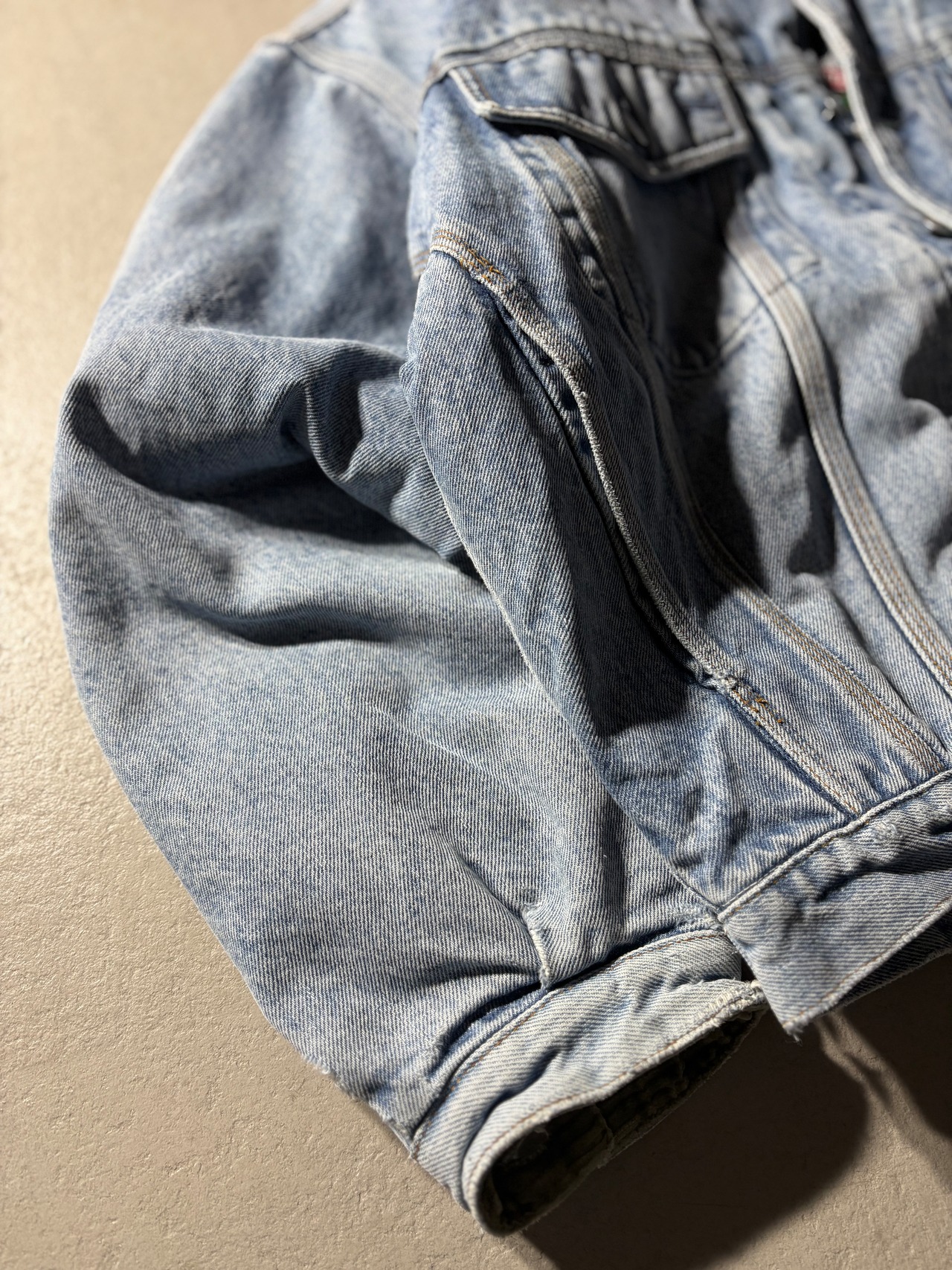 一見するとベーシックなデニムジャケットですが、内側に施されたキルティングと、ヨーロッパトラッドを強く感じさせる織りタグが、この一着の空気感を強く出しています。