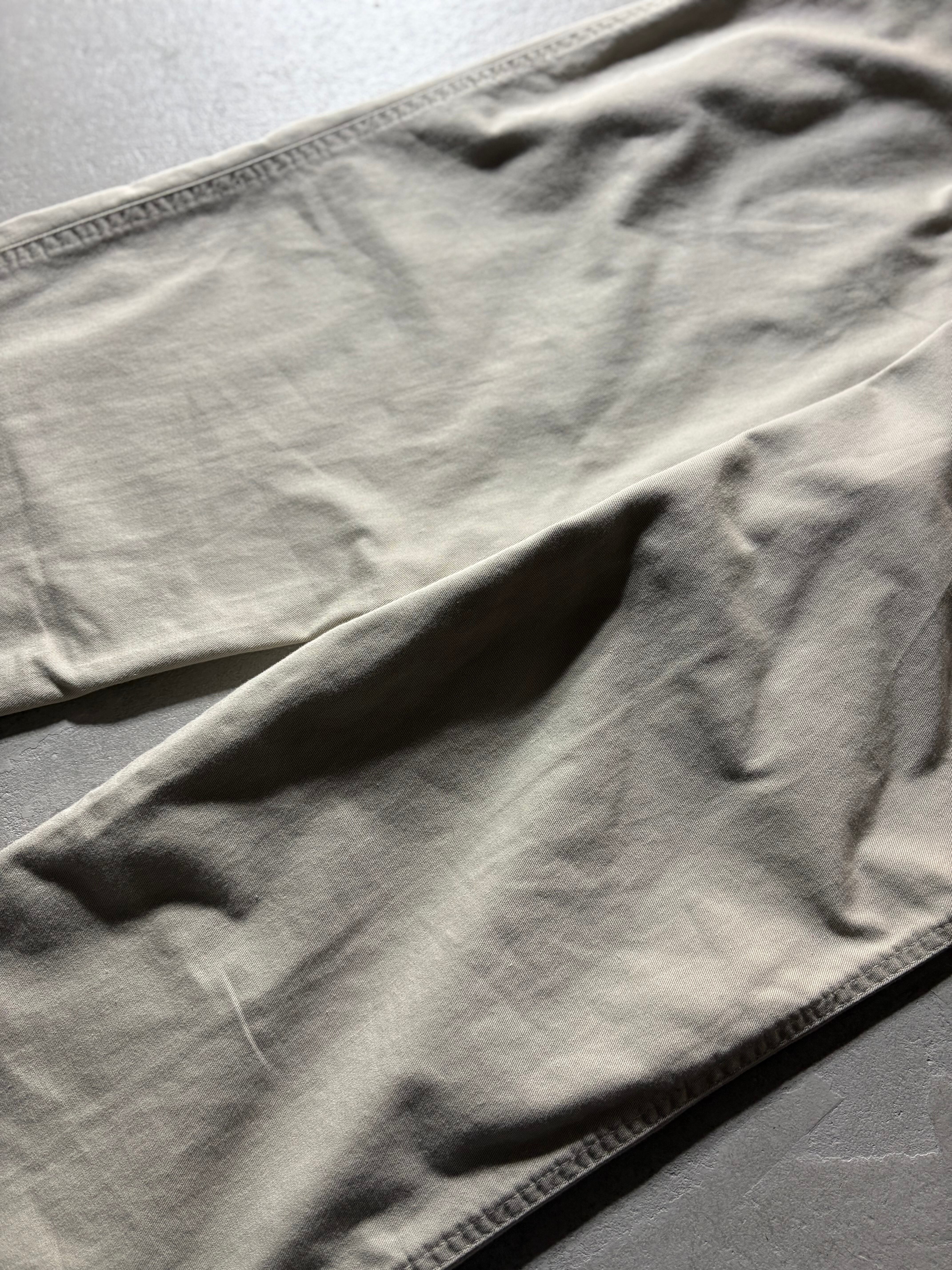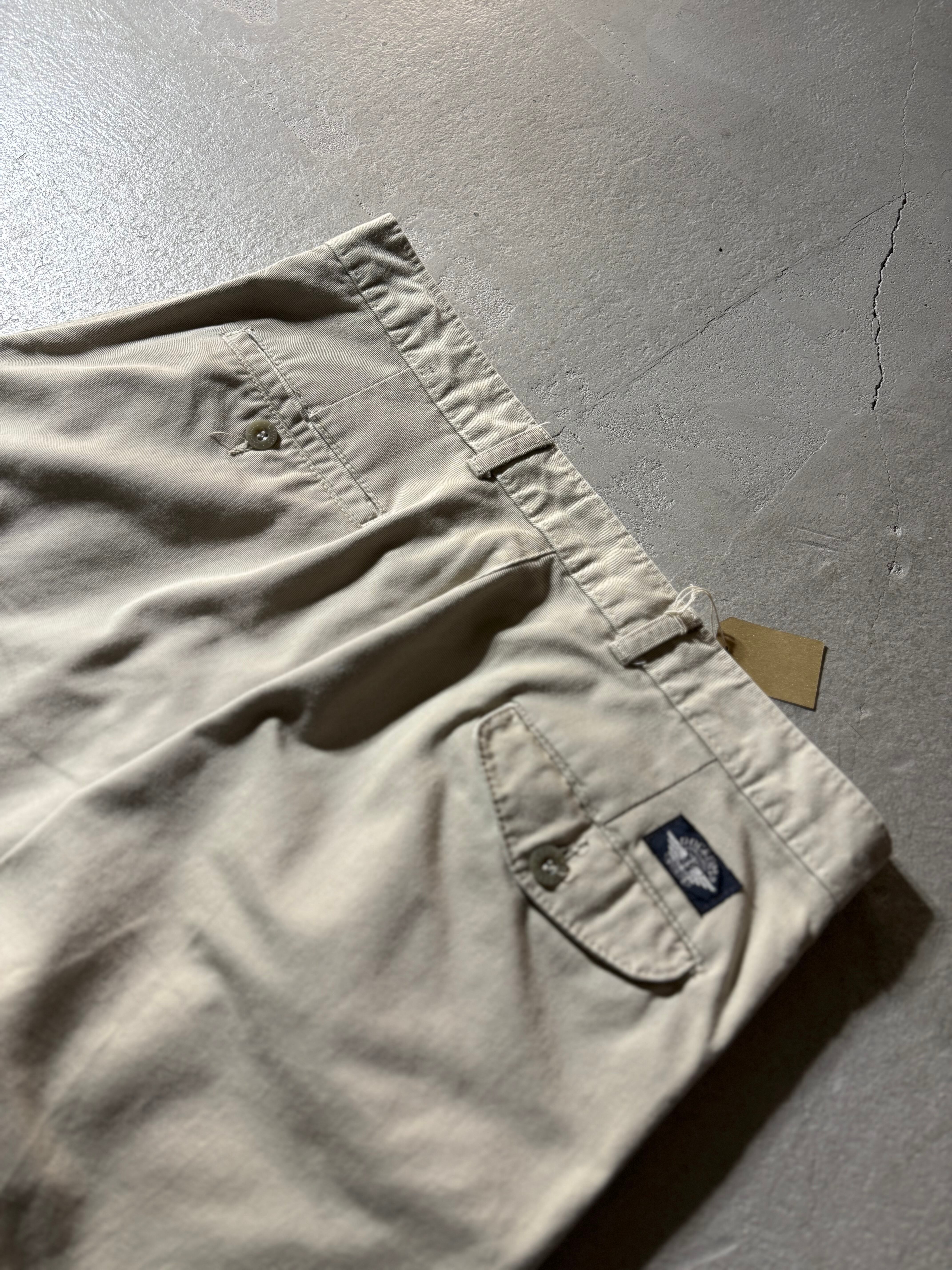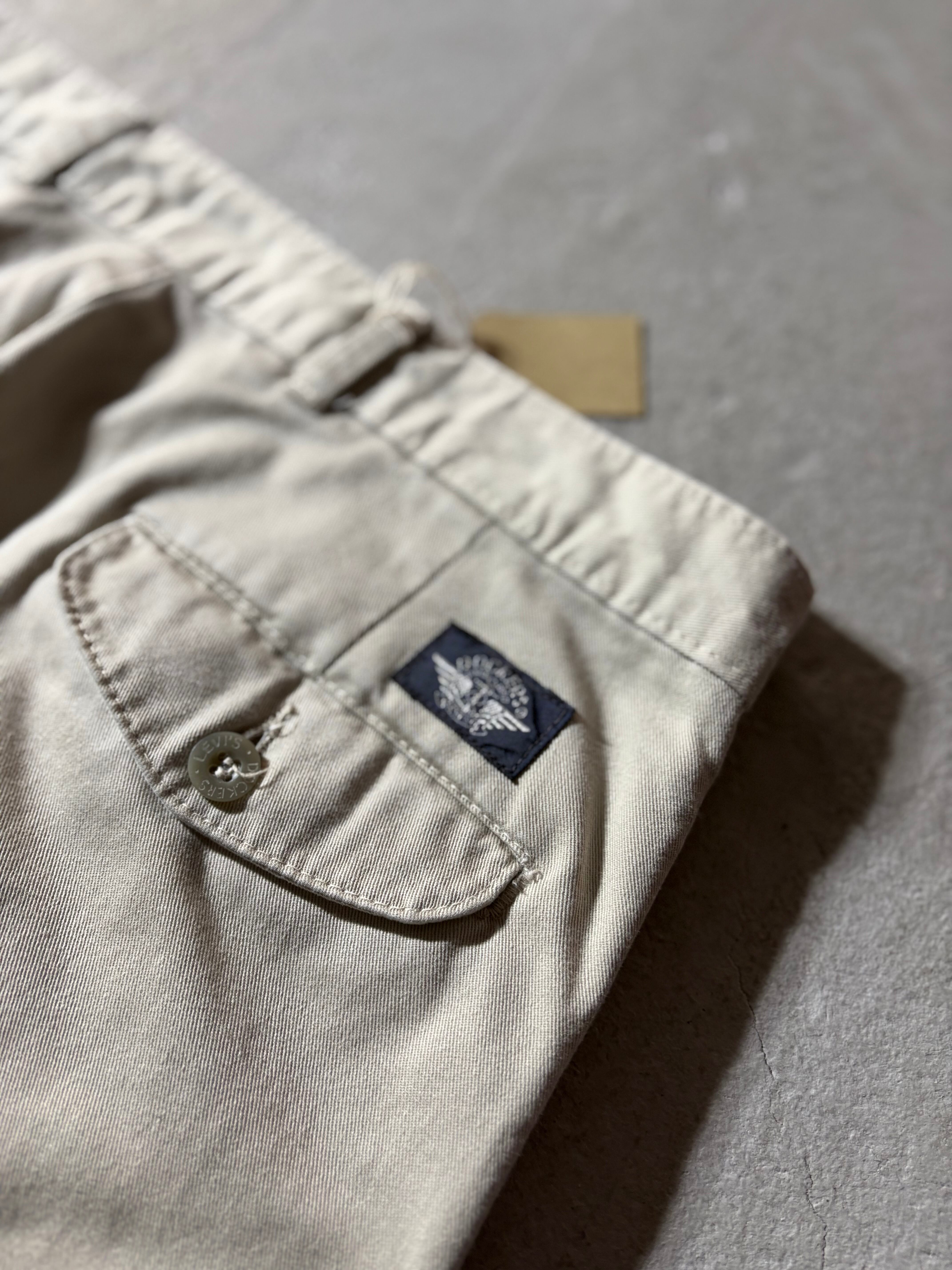 しっかりとしたハリとコシのあるチノクロス生地で、履き込むことで風合いが増していく楽しみも◎
