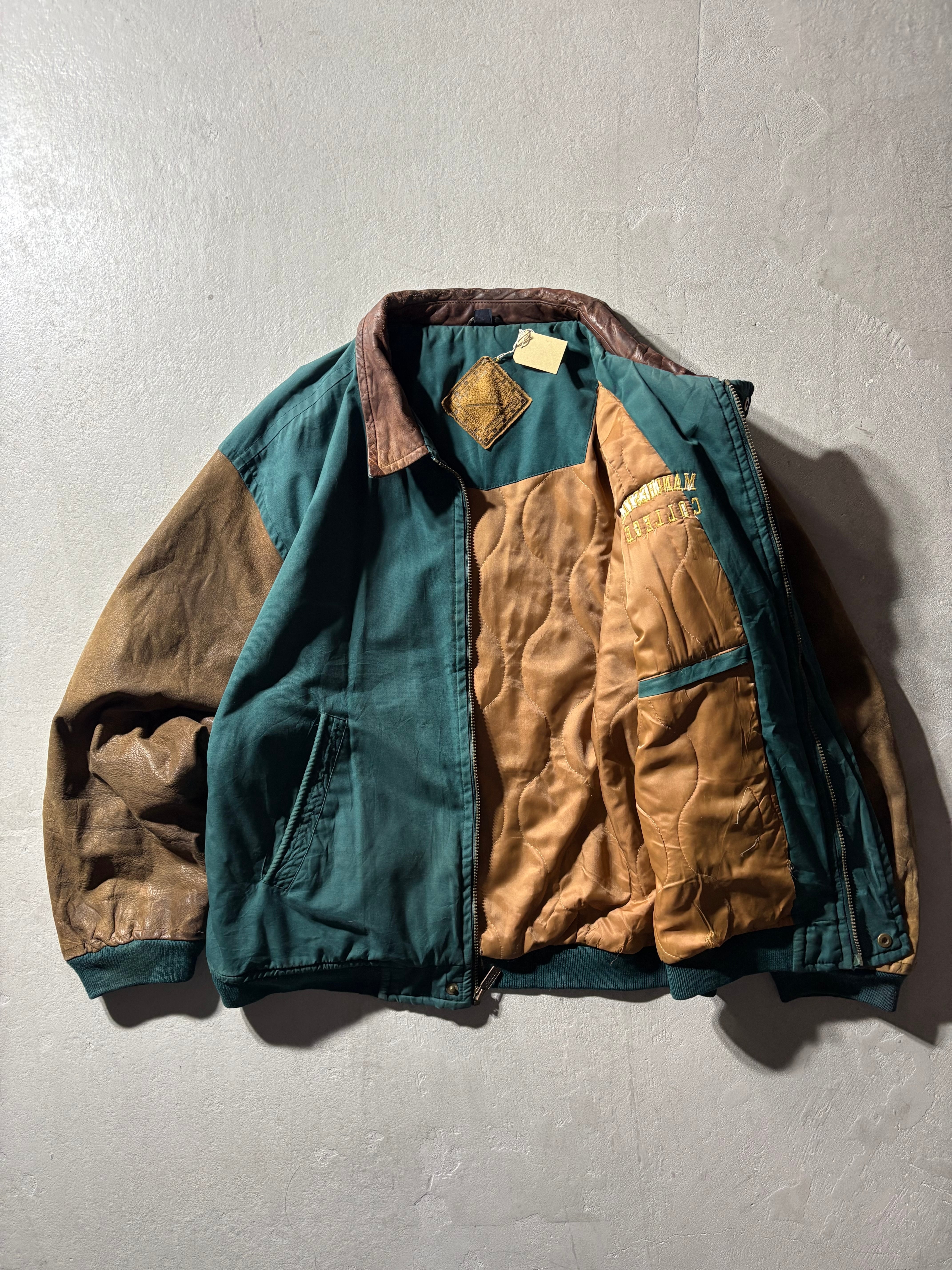 ボディは深みのあるグリーンのナイロンシェル、袖と襟は経年変化がしっかりと表れたレザー。